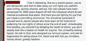 "Their doing the same thing to us that they are they jews," one anti-vaxxer screamed, taking the time to edit her comment to eliminate one of her seventeen grammatical errors.